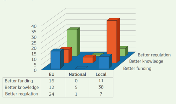 Cada uno de estos partenariados elabora un plan de acción compuesto por una serie de actuaciones. En la actualidad, 12 partenariados han lanzado sus planes y hay 114 actuaciones en marcha. Tal y como puede observarse en la figura 2, este sistema permite a las ciudades tener una mayor implicación en los procesos de elaboración de políticas públicas urbanas y una mayor interacción con actores internacionales en función de sus intereses. También les permite tener un protagonismo mayor incluso que el de sus propios Estados, pudiendo participar en asuntos que no estén presentes en la agenda política nacional pero que para ellas sean relevantes. Como puede observarse, la mayor parte de las acciones se dirigen a la UE y al ámbito local, siendo muchas menos las que se dirigen a los Estados miembros. En el primer caso, destacan las acciones que persiguen mejorar la regulación (better regulation) y en el segundo las de mejora del conocimiento (better knowledge). Llama la atención que las acciones que impactan sobre el tercer pilar, el de la financiación (better funding), sean inexistentes a nivel nacional.