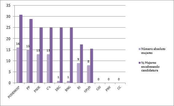 Tras la incorporación del criterio de paridad electoral en la LOREG, los partidos han modificado sus criterios de selección incluyendo, algunos de ellos, el cumplimiento de estos criterios e incluso algunos reforzando todavía más la presencia de mujeres, pero no solamente los han modificado en la práctica, sino que han institucionalizado esta pauta incorporándola como requisito en sus estatutos. Así pues, la intensidad varía desde la simple alusión al cumplimiento de la norma, en partidos como ERC, PSOE, PNV, BNG; la inclusión de criterios que garanticen el equilibrio entre hombres y mujeres en partidos como IU, Compromís, CC y Podemos o la total omisión en partidos como PP, C’s, CDC, UDC, UPyD y UPN. Ahora las preguntas giran en torno a cuántas candidatas encabezan las candidaturas, mirándose no solo a su presencia siguiendo la ley de paridad sino a sus posibilidades de conseguir el escaño al posicionarlas como primeras en las listas electorales. Entre las 51 capitales de provincia más Ceuta y Melilla, ninguno de los partidos supera a las 16 candidatas encabezando candidaturas. En el gráfico 1 observamos como, de entre los partidos de ámbito estatal, Podemos es el que mayor porcentaje presenta, seguido de cerca por el PP y C’s, curiosamente dos de los partidos que no hacen alusión alguna a la paridad en sus estatutos. Destaca también el hecho de que otras formaciones que incorporan la paridad o la garantía de equilibrio entre hombres y mujeres en las listas, como el caso de Compromís y CC, no presenten a ninguna mujer encabezando candidaturas. Parece ser que aquellos que parecen promover mayor equilibro, pese a que posiblemente lo logren, siguen incluyendo a más hombres en el primer puesto.