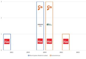 Gráfico de barras dispuesto sobre un eje temporal. Las barras de bordes azules se refieren a las elecciones municipales de Madrid y las de borde naranja a las autonómicas. Dentro de cada barra se sitúan los logos de los partidos políticos.