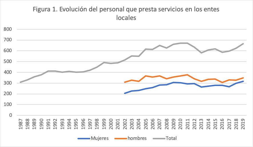 Según la EPA y tal como muestra la figura 1, el empleo público local presentó su nivel histórico más elevado en 2011, alcanzando casi 672.000 personas prestando servicios para la Administración local. Después de la reducción producida por la crisis económica y presupuestaria de los últimos años, en el año 2019 se ha recuperado casi la totalidad de puestos. Desde el año 1987 hasta la actualidad se ha duplicado el número de personas que prestan servicios en la Administración local.