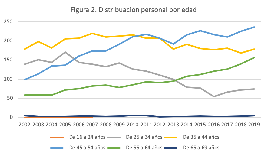 En relación con la distribución del empleo público local por edades, se puede advertir un envejecimiento de la plantilla. Desde 2002 se ha triplicado el número de personal que tiene más de 54 años y el grupo de entre 45 a 54 años ha pasado de poco más de 58.000 personas a más de 236.000. Mientras que el grupo de entre 24 a 35 ha experimentado una reducción de más de la mitad (figura 2).