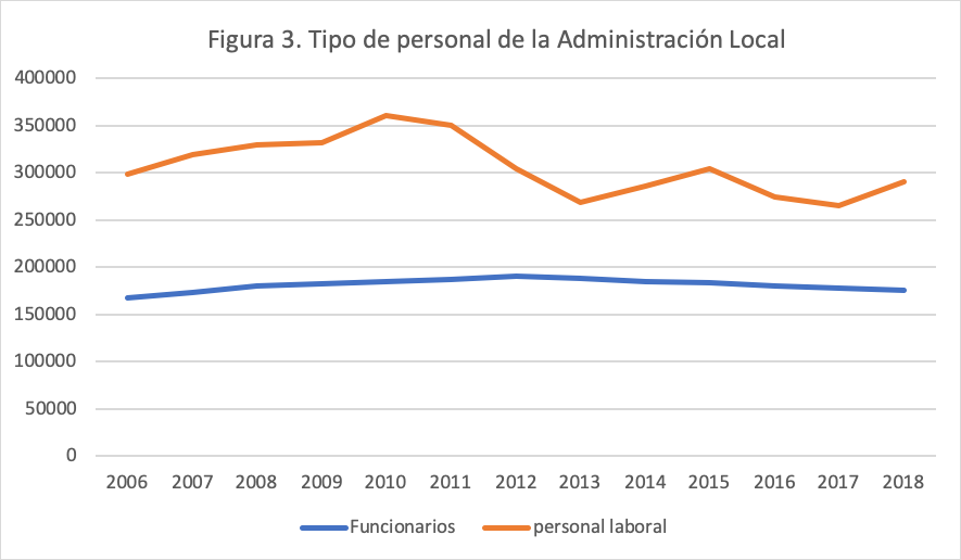 Los datos recogidos en la figura 3 muestran que la Administración local opta mayoritariamente por la contratación laboral. El personal contratado en régimen laboral supone más del 50% del personal que presta servicios en los Entes locales. En 2010, el personal laboral alcanzó la cifra de 360.731, mientras que la cifra del personal funcionario era de 185.035. En los últimos años se ha ido reduciendo la diferencia entre los dos tipos de personal por causa de la crisis económica, pero en 2018 se observa como esa diferencia vuelve a incrementarse.