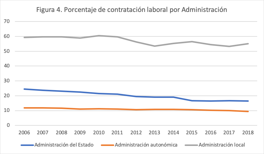 Si atendemos a la figura 4 donde se muestra el porcentaje de laboralidad por tipo de Administración, la Administración local es la que recurre con mayor intensidad a la contratación laboral, oscilando entre el 50% y el 60%. En cambio, el Estado o las Comunidades Autónomas tienen un porcentaje inferior al 20%. La tendencia de estas dos últimas es a reducir este porcentaje, mientras que los Entes locales le mantienen o incluso se observa un aumento en el último año, después de una reducción desde el año 2011.
