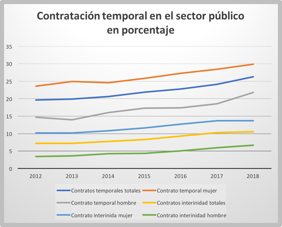 La temporalidad es uno de los más graves problemas que sufre nuestro mercado laboral. Los trabajadores que prestan sus servicios en la Administración no son ajenos a esta cuestión. Más del 25% de los trabajadores públicos tienen un contrato temporal, según los datos arrojados por la Encuesta de Población Activa para el último cuatrimestre del año 2018. Una situación que no ha hecho más que aumentar desde el año 2013 y donde las mujeres son las más perjudicadas. En concreto, más del 10% de los trabajadores del sector público tienen un contrato de trabajo temporal que cubre la usencia de otro trabajador que tiene derecho a la reserva de la plaza, contrato de interinidad por sustitución.