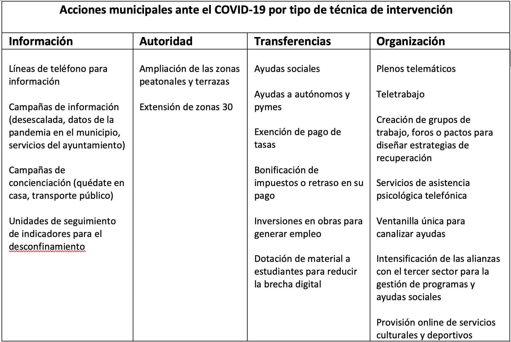 En un intento de agrupar todas estas acciones en categorías para poder avanzar un análisis, en la tabla de abajo nos servimos de la clásica tipología NATO (Hood, 1986) de instrumentos de políticas públicas para poder identificar las distintas modalidades de actuación. Esta tipología clasifica las técnicas de intervención pública en cuatro grandes categorías según el tipo de recurso gubernamental al que se recurre para la acción. Así, se distingue entre a) instrumentos basados en la activación de información para asistir, concienciar o exhortar  (Nodality),  b) instrumentos basados en la autoridad (Authority) que activan poderes legales para disciplinar conductas, c) instrumentos basados en la activación de recursos económicos a través de transferencias a ciudadanos o empresas o de éstos a las administraciones públicas  (subvenciones, bonificaciones fiscales, tasas, impuestos, etc.) (Treasure) y d) instrumentos basados en la organización (Organization). La tabla 1 recoge las medidas más típicas que se han adoptado para luchar contra la pandemia; no es una lista exhaustiva pero sí representativa de las estrategias municipales.