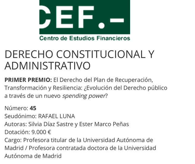 En la modalidad de derecho constitucional y administrativo han sido premiadas dos profesoras de la Universidad Autónoma de Madrid.El trabajo «El Derecho del Plan de Recuperación, Transformación y Resiliencia: ¿Evolución del Derecho público a través de un nuevo spending power?» elaborado por Silvia Díaz Sastre y Ester Marco Peñas ha obtenido el primer premio en la modalidad de derecho constitucional y administrativo. Más información aquí.