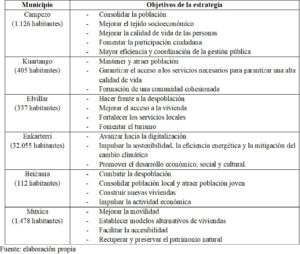 A pesar de las diferencias contextuales, todas las estrategias compartían el desafío de atraer a personas jóvenes y crear las condiciones adecuadas para poder vivir y trabajar en estos municipios. Además, buscaban desarrollar proyectos orientados a consolidar población en el municipio y a fomentar el desarrollo económico de los entornos rurales, para que sus habitantes pudieran disfrutar de una alta calidad de vida y desarrollar sus proyectos vitales. Para alcanzar estos objetivos, las estrategias diseñadas por los municipios se centraron en revitalizar sector primario, atraer a empresas, fomentar el emprendimiento, la innovación y el teletrabajo, y adoptar un nuevo modelo económico orientado hacia un turismo responsable.